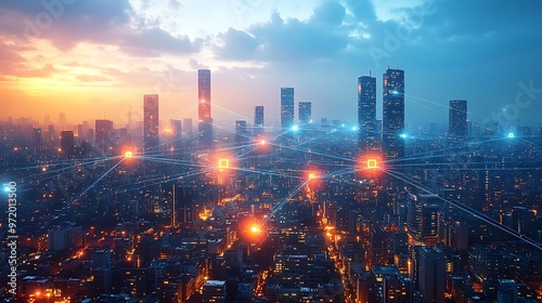 © TranNgoc, Fototapeta premium A futuristic city glowing with neon data lines connecting mobile devices, homes, and skyscrapers. The skyline pulses with digital energy,