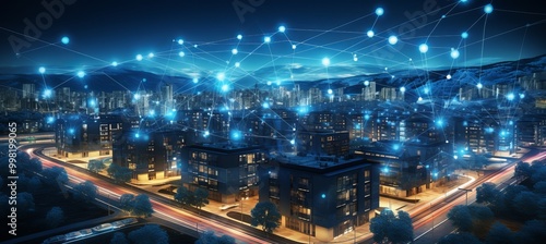 Fototapeta premium A futuristic city illuminated at night with digital connections across buildings and streets