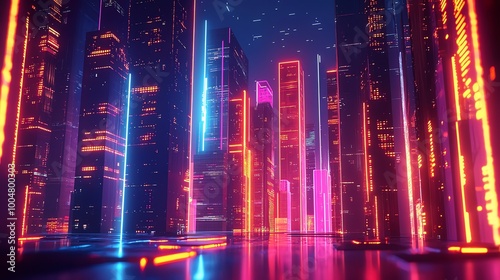 © Rstm, Obraz premium A futuristic city lit by neon lights and glowing with a vibrant, colorful energy.