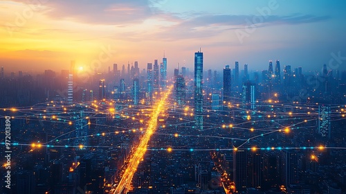 © TranNgoc, Fototapeta premium A futuristic city seen from a drone’s perspective, with illuminated data streams flowing between smart buildings and roads. The glowing communication lines form a network of energy and technology,