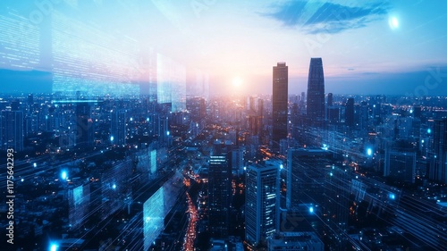 Fototapeta premium A Futuristic city skyline at sunset with glowing holographic elements