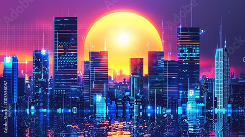 © Galib, Fototapeta premium A futuristic city skyline at sunset, with neon lights.