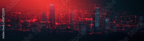 Fototapeta premium A futuristic city skyline illuminated in red, featuring abstract digital...