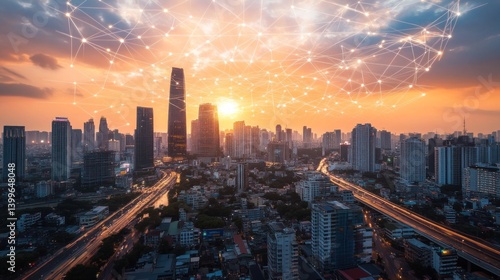 Fototapeta premium A futuristic city skyline symbolizing economic growth, bustling with trade...