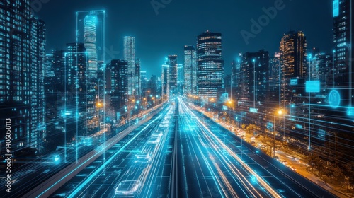 Fototapeta premium A futuristic city skyline with glowing buildings and holographic vehicles moving between skyscrapers in a digital world.