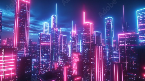 Fototapeta premium A futuristic city skyline with glowing pink and blue neon lights.