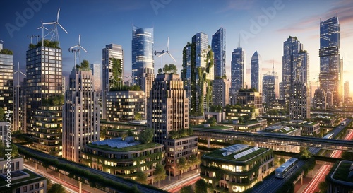 Fototapeta premium A futuristic city skyline with green buildings and wind turbines under a...
