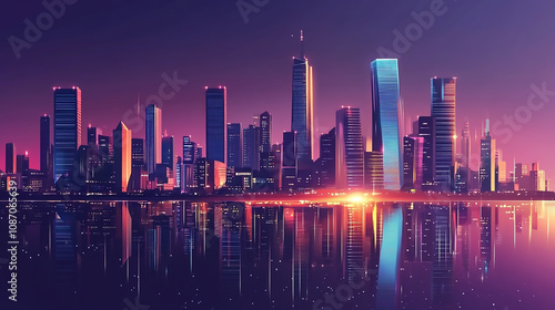 Fototapeta premium A futuristic city skyline with skyscrapers reaching towards a vibrant purple sky at dusk Vibrant futuristic city at sunset, colorful skyscrapers with sleek windows, modern design, dynamic illustration