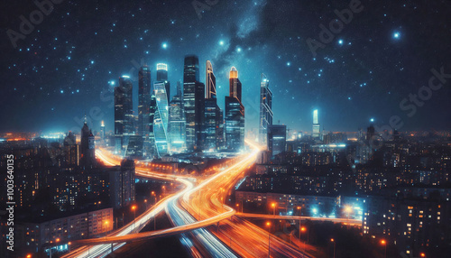 Fototapeta premium A futuristic city under a clear starry sky, with neon-lit skyscrapers and glowing highways curving through the cityscape