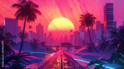 © cff999, Fototapeta premium a futuristic city with palm trees and a sunset
