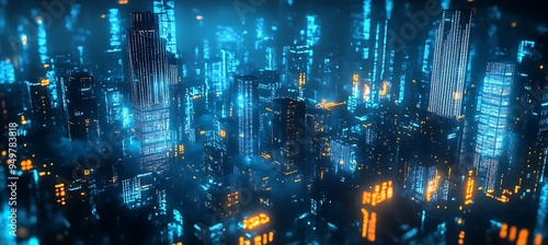 © Huzaifa, Fototapeta premium A futuristic city with towering skyscrapers and digital holograms