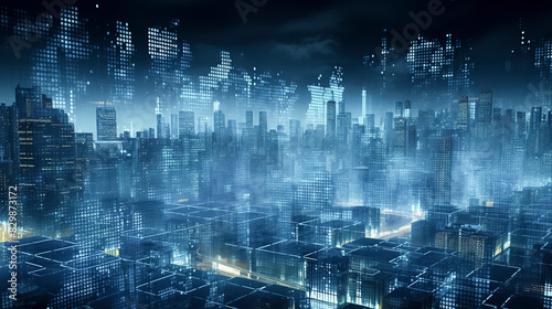 © larrui, Fototapeta premium A futuristic cityscape at night, illuminated buildings and grids create a complex, digital, and mysterious atmosphere