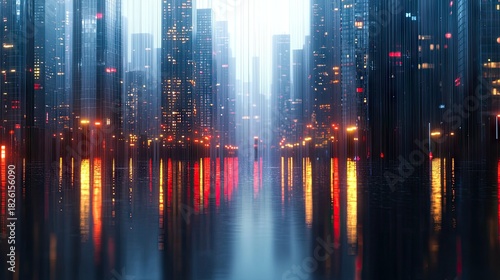 © radian, Fototapeta premium A futuristic cityscape at night, with towering skyscrapers illuminated by city lights and their reflections shimmering on a wet surface.