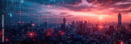© NDmCX-Nic, Fototapeta premium A futuristic cityscape at sunset with glowing lights and a dramatic sky.