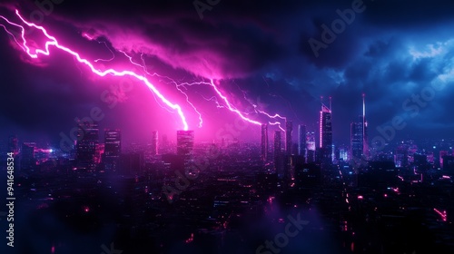 Fototapeta premium A futuristic cityscape bathed in neon lights is illuminated by a powerful lightning strike, symbolizing progress, technology, and the unpredictable forces of nature.