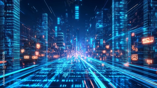 Fototapeta premium A futuristic cityscape filled with glowing skyscrapers and digital elements,...