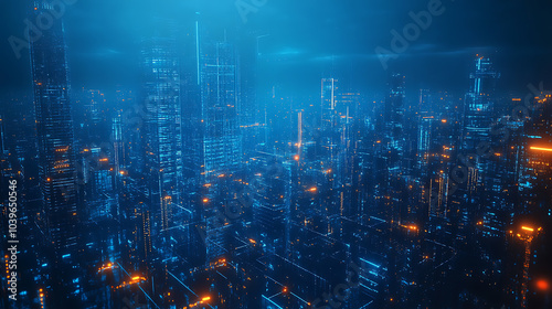 Fototapeta premium A futuristic cityscape illuminated by a vibrant blue glow, with towering...