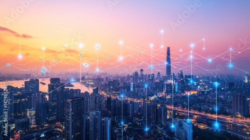 © musthofa, Fototapeta premium A futuristic cityscape, illuminated by a vibrant sunset.