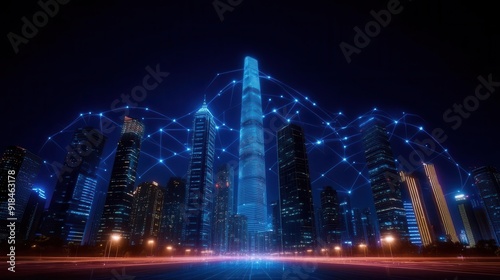 Obraz premium A futuristic cityscape illuminated by blue lights, showcasing skyscrapers connected through a digital network at night.