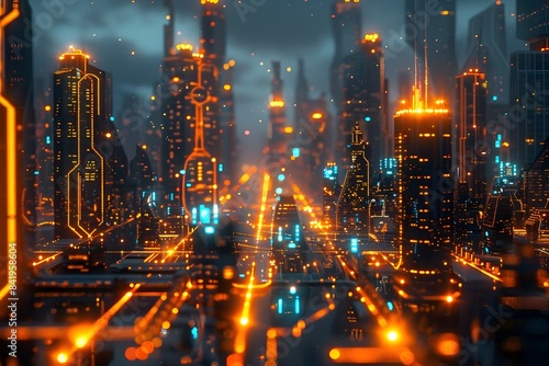 Naklejka premium A futuristic cityscape illuminated by glowing AI powered infrastructure, with...