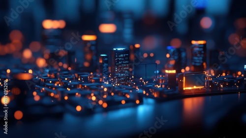Obraz premium A futuristic cityscape illuminated with glowing lights, creating a vibrant, tech-inspired atmosphere.