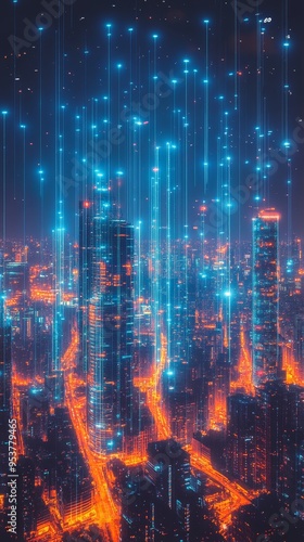 © Lightgeo, Obraz premium A futuristic cityscape showcasing glowing lights and digital effects, representing technological advancement and innovation.