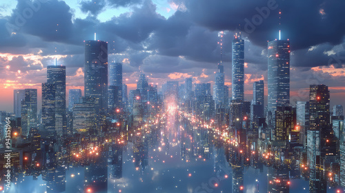Fototapeta premium A futuristic cityscape showcasing tall skyscrapers with lights illuminating the skyline, reflecting in a calm water surface, depicting modernity and technological advancement.