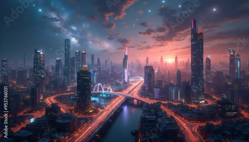 © ismail, Fototapeta premium a futuristic cityscape unfolds before your eyes dotted with towering skyscrapers and flashing lights A colorful map of the city takes you past revealing the vast expanse of cosmos generative ai