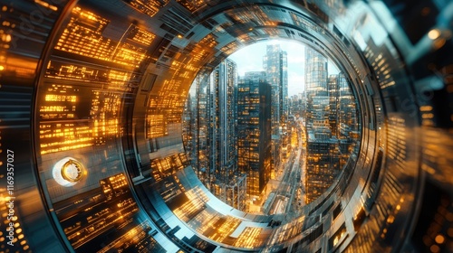 Obraz premium A futuristic cityscape viewed through a high-tech tunnel with glowing data...