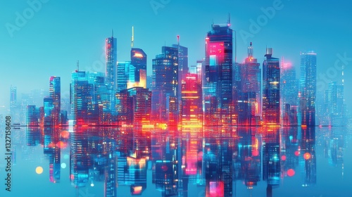 © Npicture, Fototapeta premium A futuristic cityscape with colorful lights reflected in water