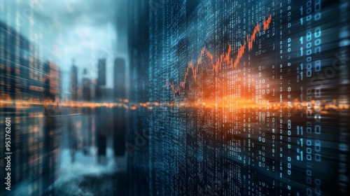 © tinnakorn, Fototapeta premium A futuristic cityscape with digital elements, showcasing data streams and a rising graph, representing technology and finance.