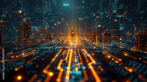 Fototapeta premium A futuristic cityscape with glowing circuits and digital elements.