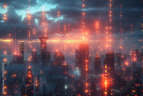 © sennauli, Obraz premium A futuristic cityscape with glowing lights and a cloudy sky, representing technological advancement and digital connectivity.