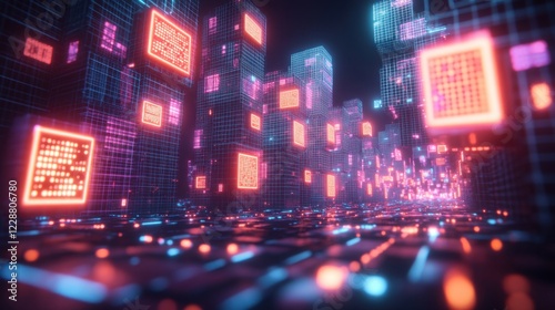 Fototapeta premium A futuristic cityscape with glowing neon grids and digital elements.