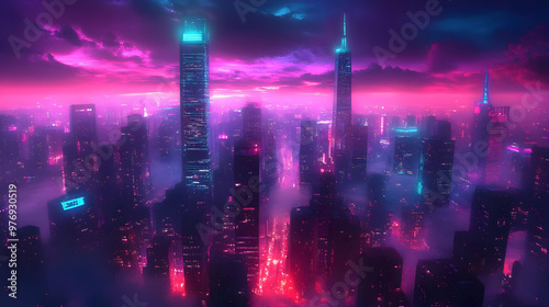 © Siasart Stock, Obraz premium A futuristic cityscape with glowing skyscrapers and a pink and blue sky.