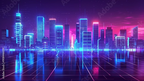 © Galib, Fototapeta premium A futuristic cityscape with neon lights and a digital grid.