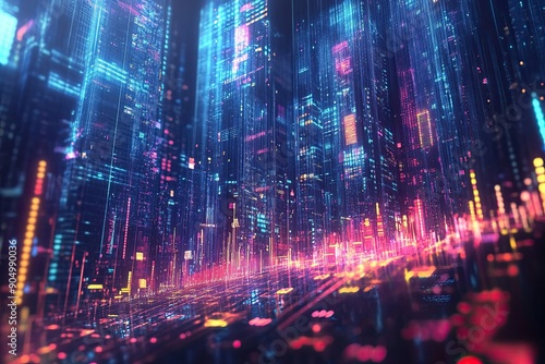 Naklejka premium A Futuristic Cityscape with Neon Lights and Digital Data Streams