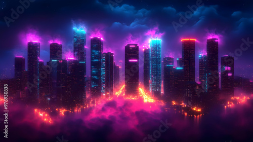 © Siasart Stock, Fototapeta premium A futuristic cityscape with neon lights and glowing clouds.