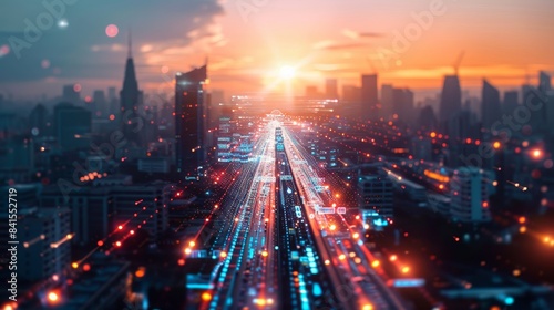 Fototapeta premium A futuristic cityscape with neon lights forming thought bubbles, showcasing a...