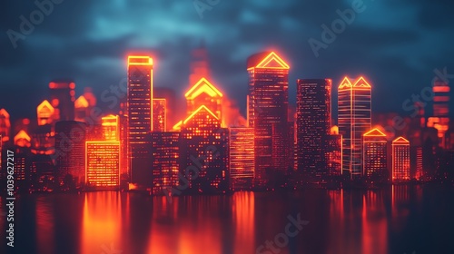 © nurionstudio, Fototapeta premium A futuristic cityscape with neon lights reflecting on the water, against a cloudy night sky.