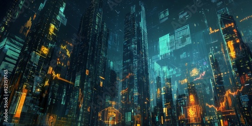 Fototapeta premium A futuristic cityscape with towering skyscrapers adorned with holographic financial charts