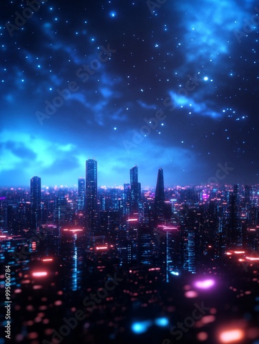 Obraz premium A futuristic cityscape with towering structures illuminated by neon lights under a starry night sky, symbolizing technological advancement, urban development, modern architecture, a sense of wonder, a