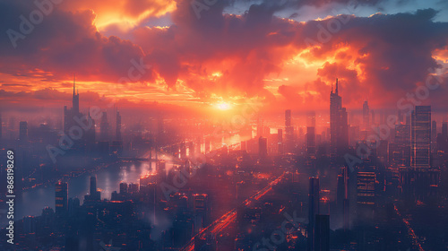 © Wasin Arsasoi, Fototapeta premium A futuristic cityscape with wireless communication towers, ultra-high definition,