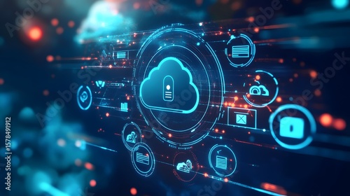 © Ytnart, Obraz premium A futuristic cloud computing concept showcasing digital security, data protection, and interconnected devices