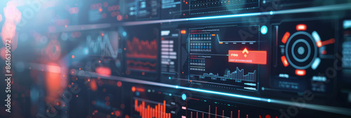 © Maximusdn, Obraz premium A futuristic computer monitor showing a dynamic, abstract network monitoring dashboard with pulsing graphs and data analytics .