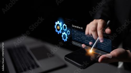 Fototapeta premium A futuristic concept of an enterprise Artificial Intelligence platform. This system uses machine learning for business automation, data analysis, and powering generative solutions. Fermion