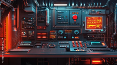 © embun, Obraz premium A futuristic control panel displays complex illuminated electronics instruments