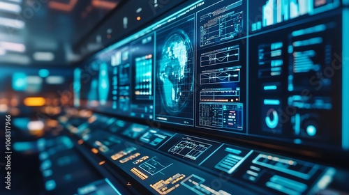 © lisa, Obraz premium A futuristic control panel with a world map and various data displays.