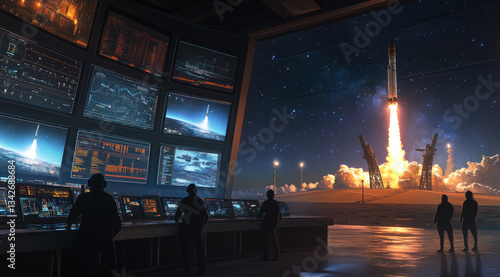 © YIfan, Fototapeta premium A futuristic control room with multiple screens displaying space flight data, workers in dark suits observing the launch on large video walls, an Apollo-era rocket taking off outside against a starry