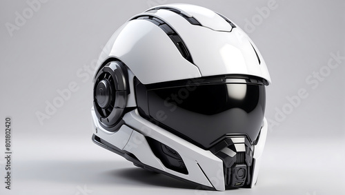 Fototapeta premium A futuristic cybernetic helmet on a white background with a gray background,...